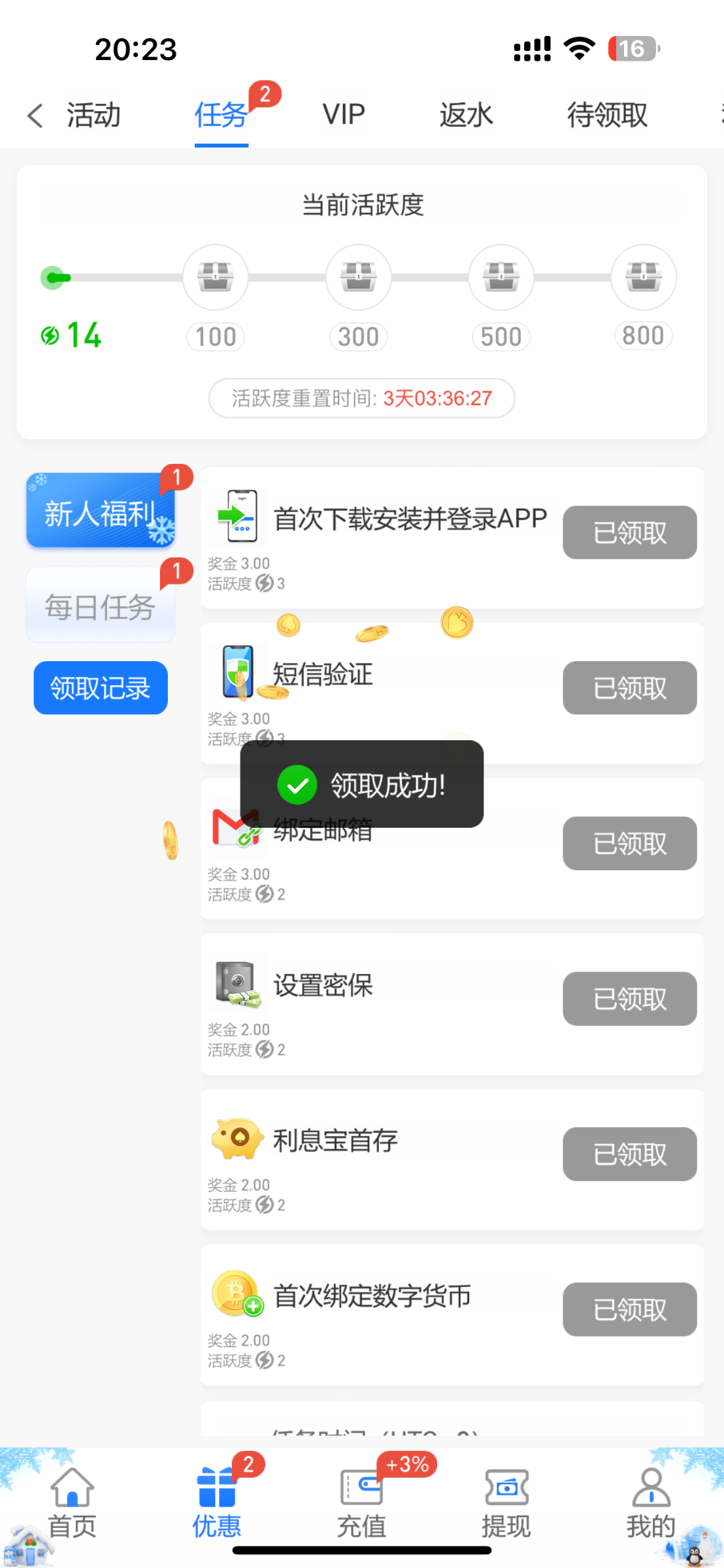 新人注册绑卡,任务栏小任务完成领18彩金,出款自测!